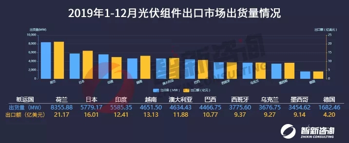 从出口区域市场来看,荷兰出货量8.35GW,出口额21.17亿美元,排名第一,日本出货量5.77GW,出口额16.01亿美元,位居第二,印度出货量5.58GW,出口额12.41亿美元,排名第三。