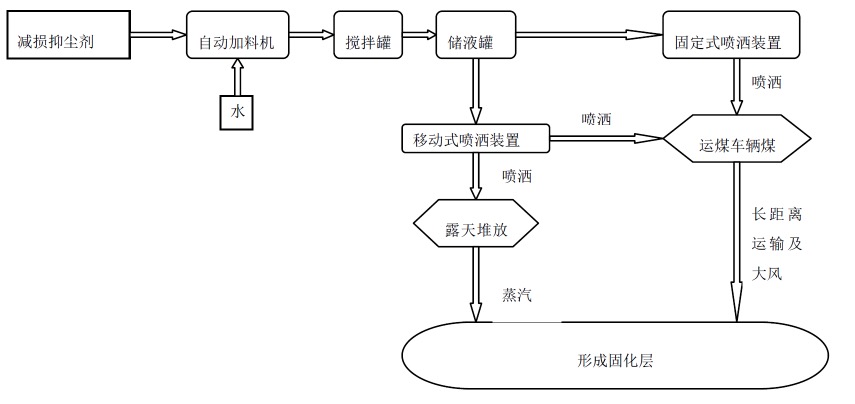 通过设备将减损抑尘剂喷洒到煤炭或粉状物料表面后,形成固化层,以达到降低损耗、防治扬尘的目的。