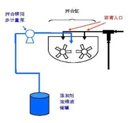 表面活性剂法温拌沥青混合料生产工艺流程:用温拌表面活性剂配制一定浓度的水溶液,然后在沥青和集料拌和过程中喷入该溶液,经充分搅拌后生产出温拌混合料。以出料温度为120℃的温拌沥青混合料为例,其拌和工艺为:(1)在拌和锅中将约135℃的热集料干拌;(2)在130℃左右的沥青开始喷出后随即喷出50℃左右的表面活性剂水溶液;(3)充分拌和生产出120℃左右的温拌混合料。工艺流程见图1,温拌表面活性剂溶液添加设备示意图见图2。