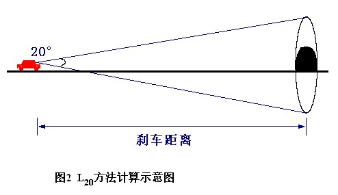 这是隧道入口前的部分路面,严格说来它不是隧道部分。在这一区域驾驶员必须能够看清隧道内部和可能的障碍物,才不至于降低车速。这一区域的驾驶员的亮度适应情况将决定了下一区域需要的亮度水平。CIE计算这个亮度适应的方法是L20方法,它计算的是在进入区的起点以驾驶员的视线为中心的20°的视角范围内四周、天空及路面的平均亮度(如图2所示)。很明显白天的亮度要明显高于晚间,因此隧道照明白天的要求更高。