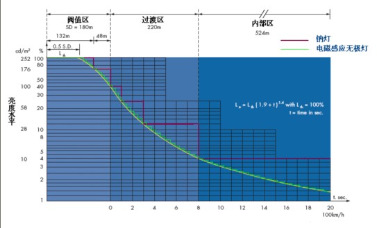 当然在实际隧道照明中应用电磁感应无极灯还需要很多的工作,例如设计合理灯具的反射器,提高灯具的效率等来解决高亮度照明的要求。但从前面的发现和其它光源在隧道照明中应用的情况来看,电磁感应无极灯在隧道照明中的应用会有其一定的特点。