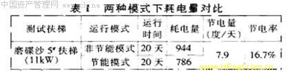 为了测试扶梯在两种运行模式下的能耗情况,我们以一台llkW扶梯进行实际测试,在扶梯上加装电度表,监测其在两种模式下20天(每天连续运行18h)的耗电量。测试结果如表1。